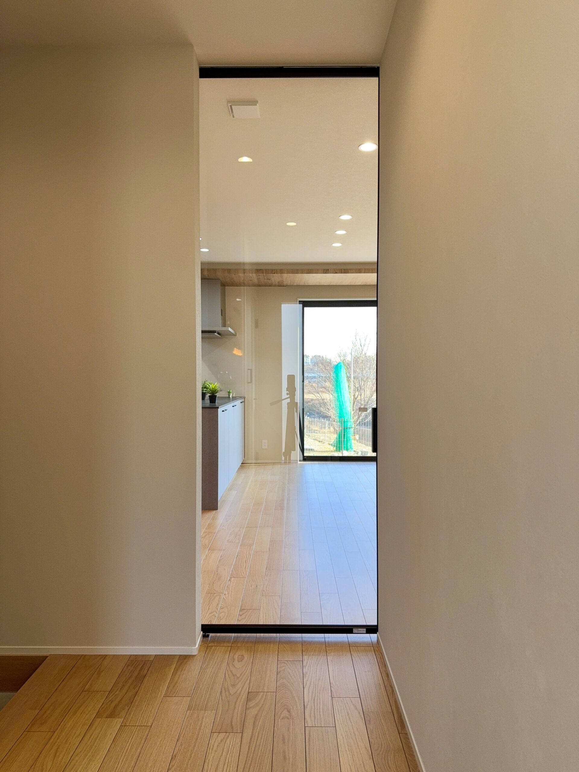 リビングドアをエアビュー(ガラス引き戸)にし、対面や対角に窓を配しています。