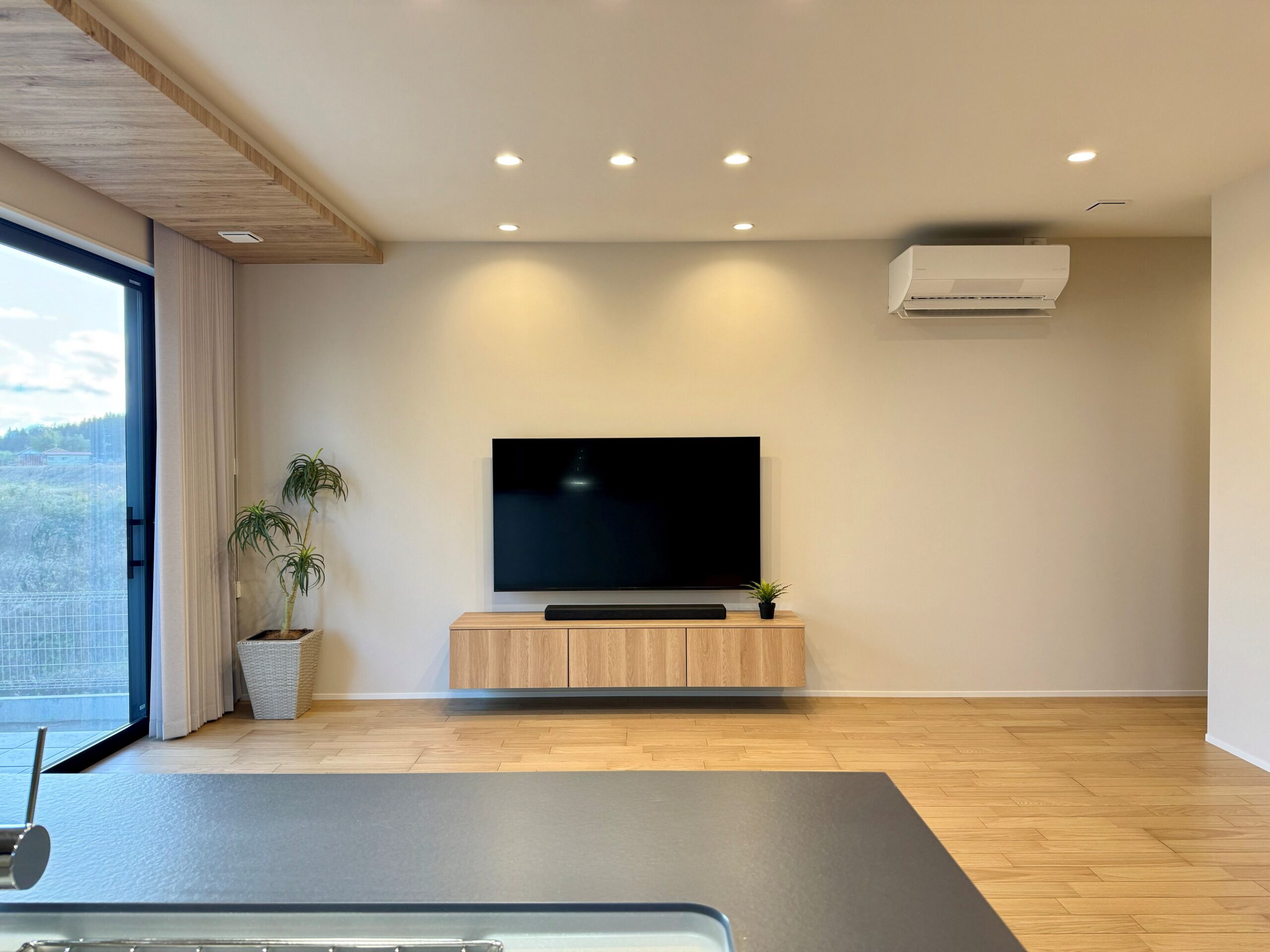 新築、LDK、キッチン、ダイニング、エアビュー、ガラス引き戸、パントリー、ペンダント照明